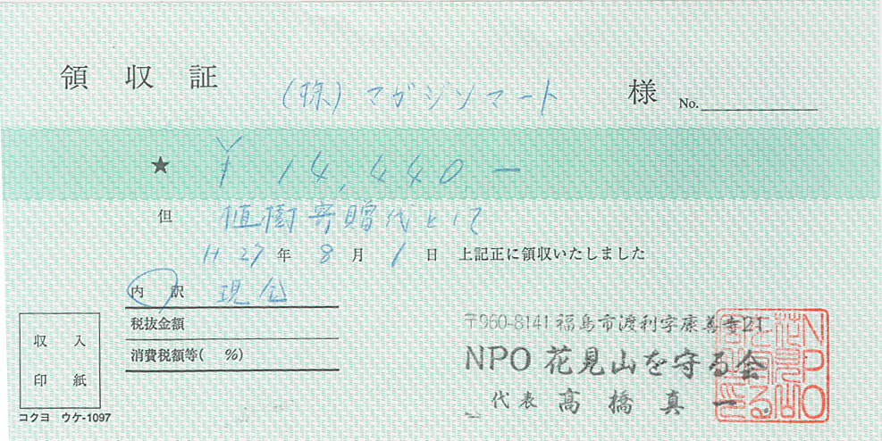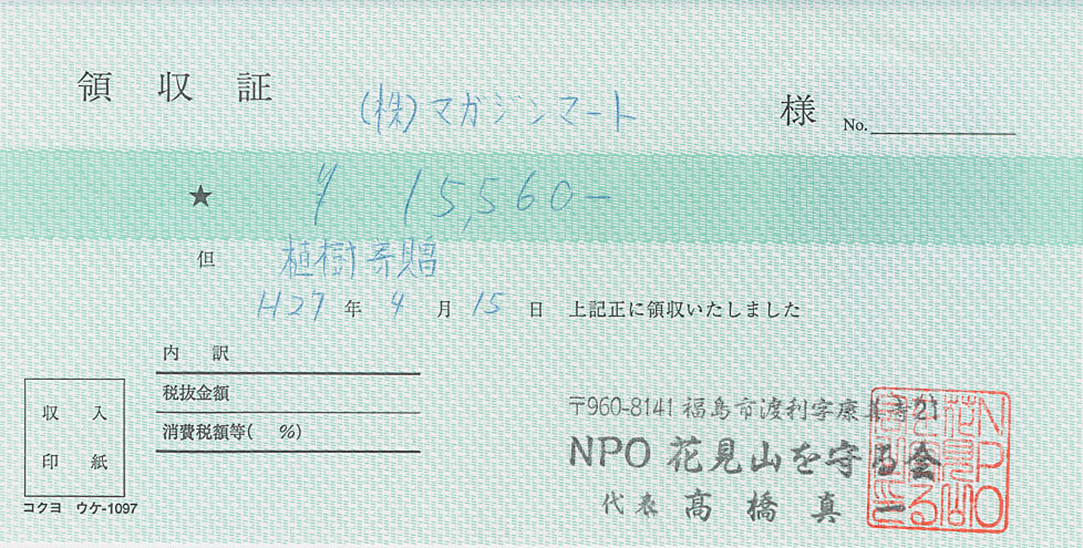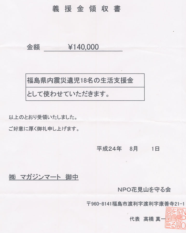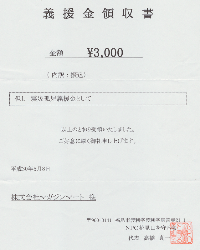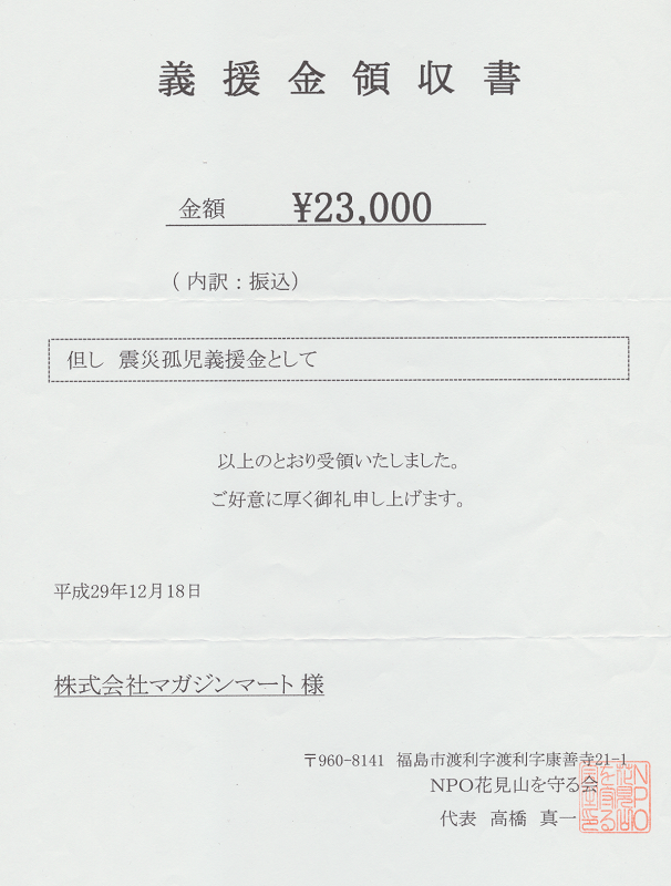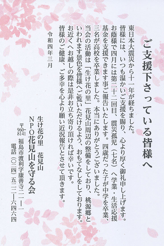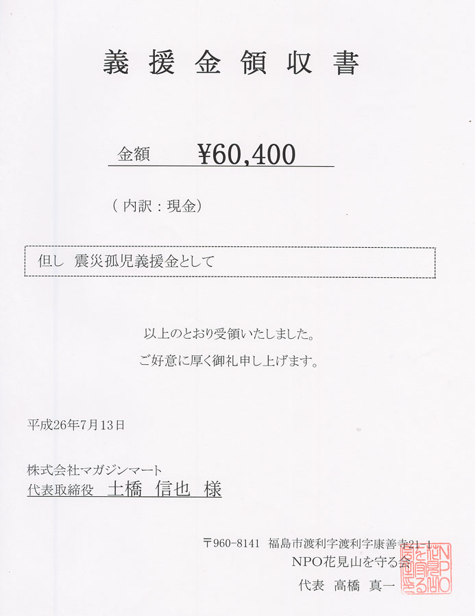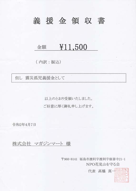 「NPO 花見山を守る会」の「震災孤児支援金」[外部リンク] に寄付致しました。