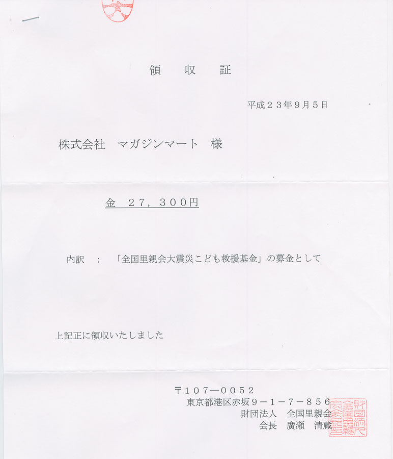 →【結果報告】 寄付金の総額は、¥140,000(14万円)となりました。手芸雑誌ひと箱と当店スタッフの寄せ書きと共にお届けしました。皆さまからのご支援に心より御礼申し上げます。 [2012年8月29日]
