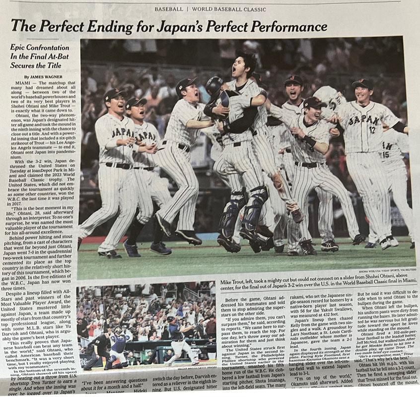 フロリダのマイアミで行われたWBC決勝(3/21)について、二つの記事を掲載しています。(掲載場所は一面ではありません。)