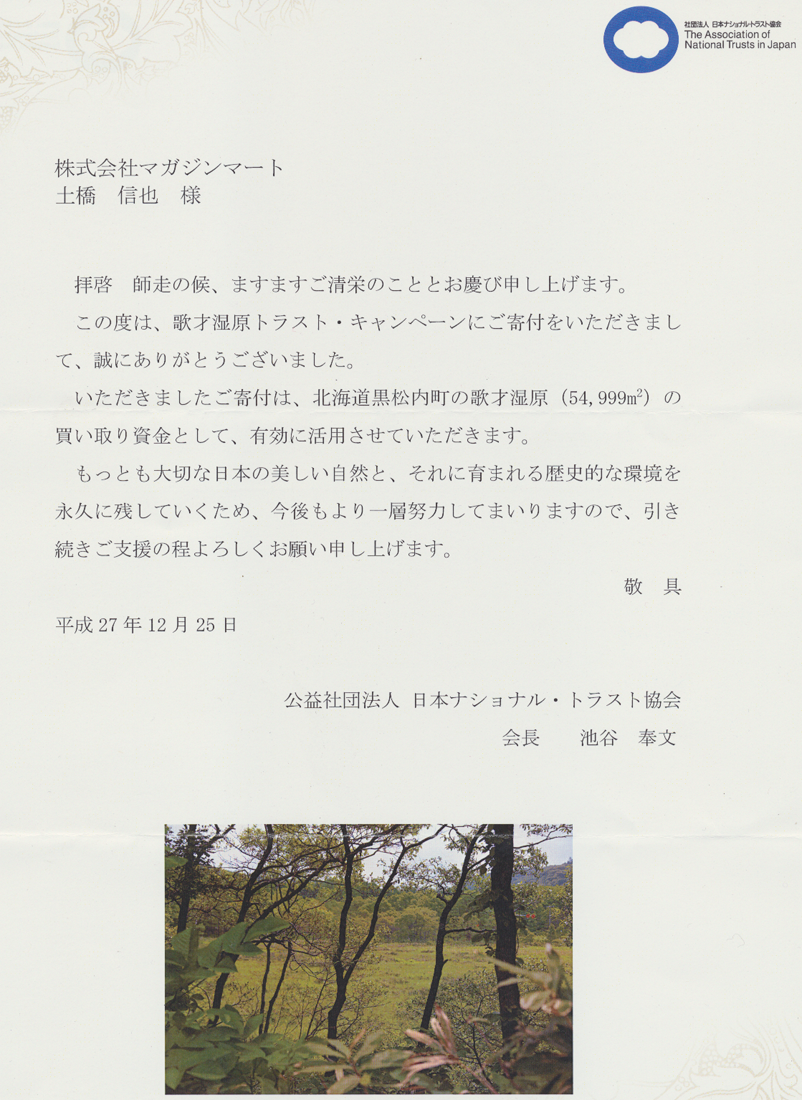 おかげさまで、日本ナショナル・トラスト協会が募集していた北海道の貴重な湿原を守るための基金に、¥67,500を寄付させていただきました。
