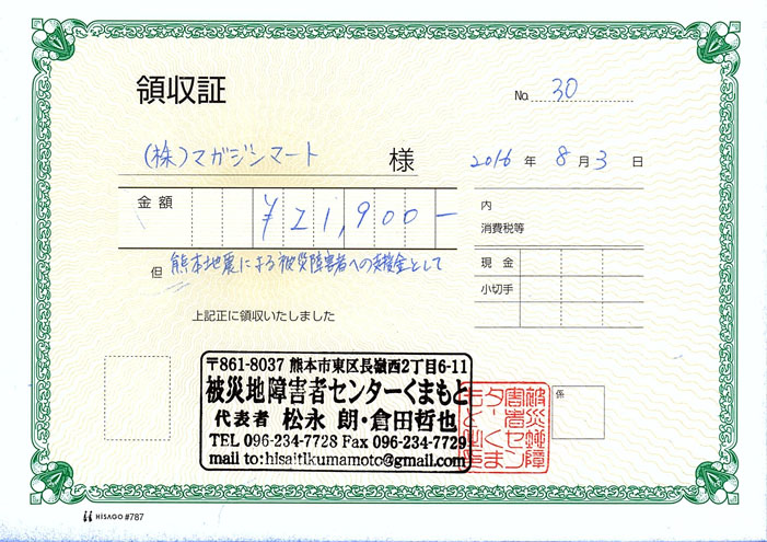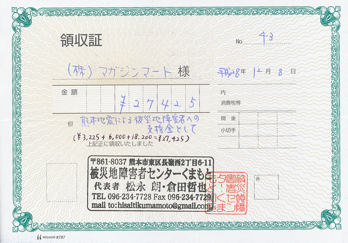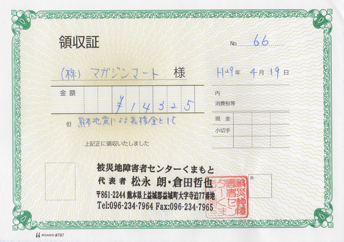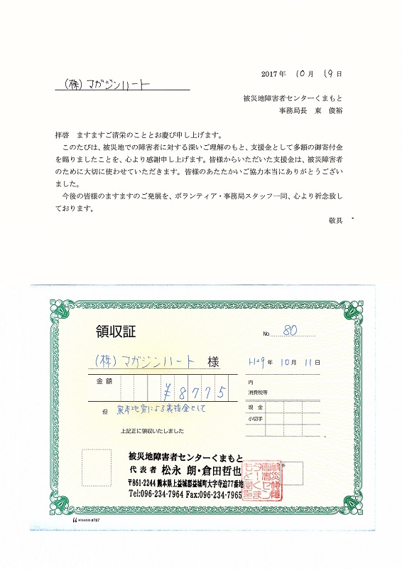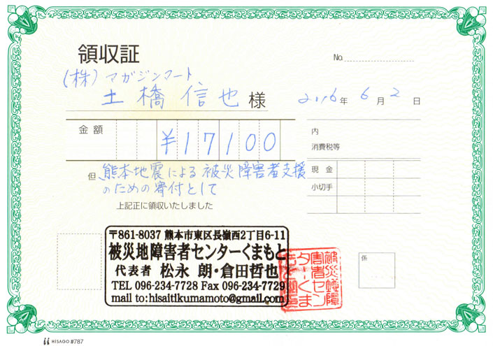 極めて不自由で厳しい生活を強いられているはずの被災障害者の皆さま、そしてボランティア精神のみでそのような方々を支援し続けている「被災地障害者センターくまもと」の方々に、誠にささやかな規模で恐縮ではございますが皆さまのご健康と一日も早い復旧への願いを込めまして、今回の支援金をお送りさせていただきます。[2016年6月14日]
