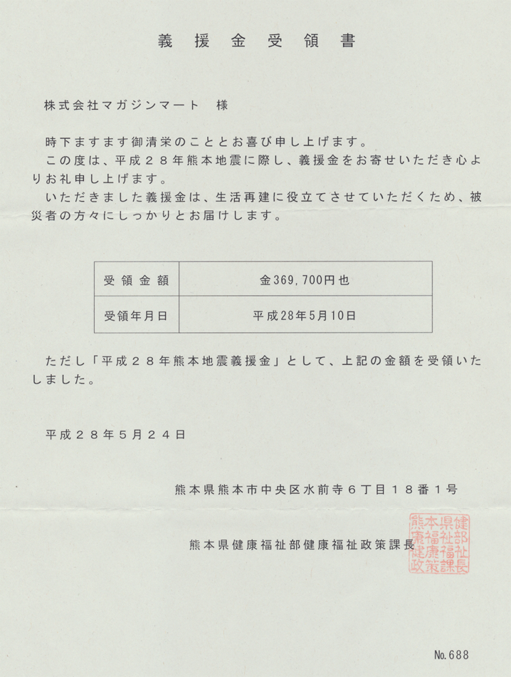 一日も早く皆さまが震災前のご生活を取り戻されますよう、この義援金に願いを込めさせていただきます。