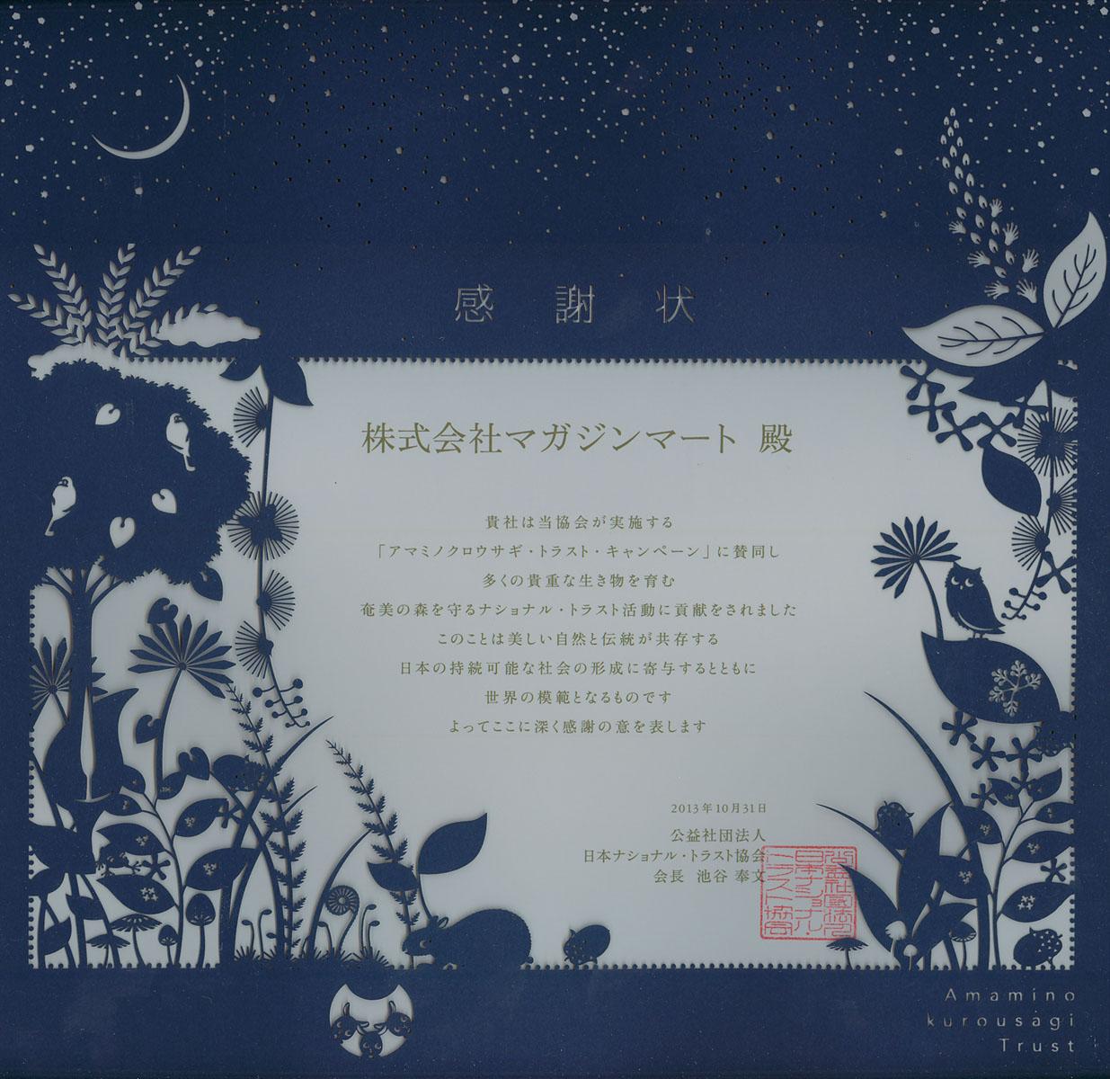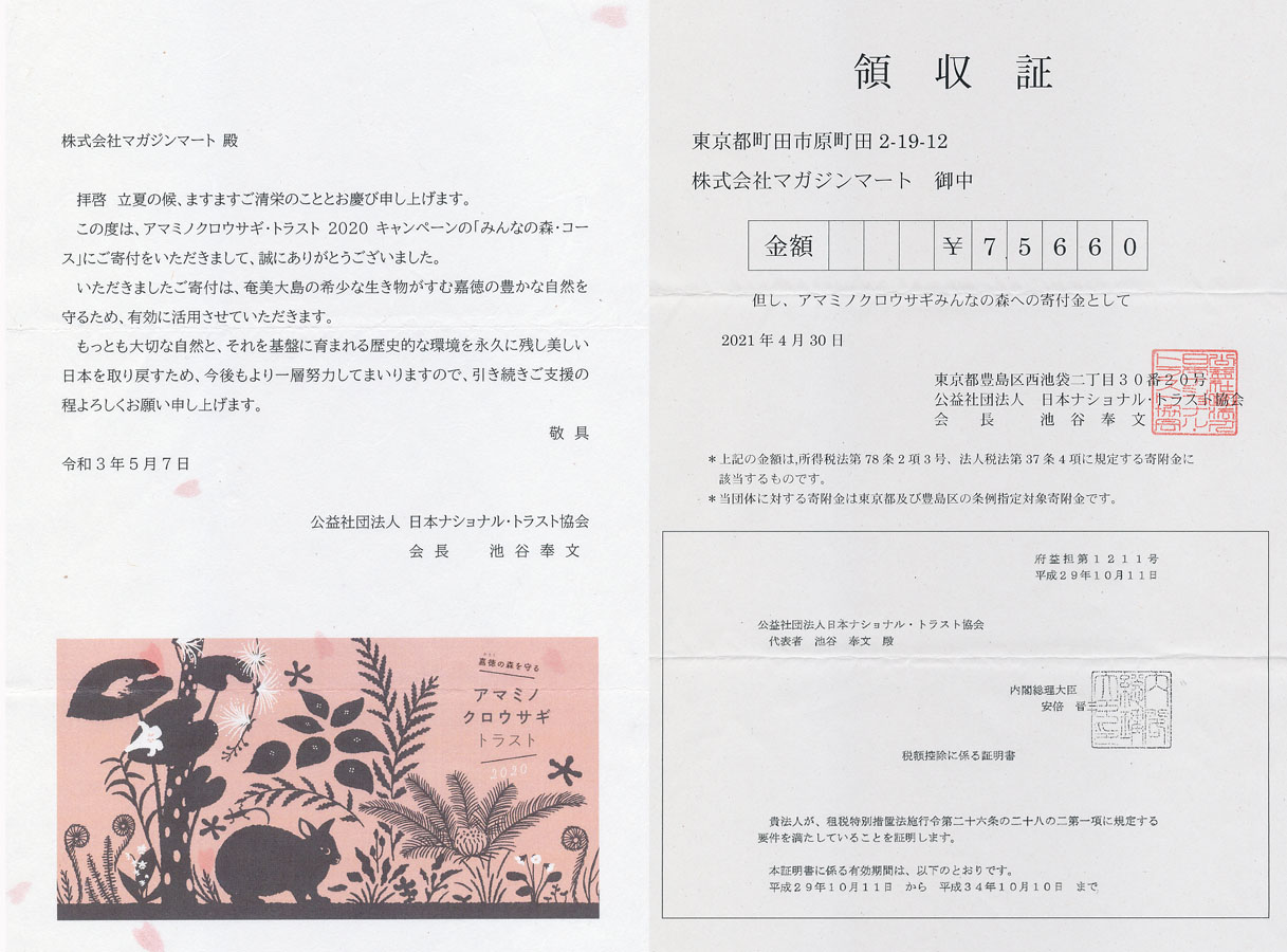 日本固有の貴重な”うさぎ”を守る運動に喜んで寄付をさせていただくこととしました。