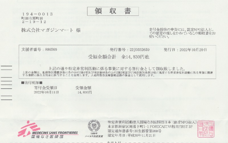 | MSF合計 | ¥14,830 | 寄付実施[2022/9/15] |