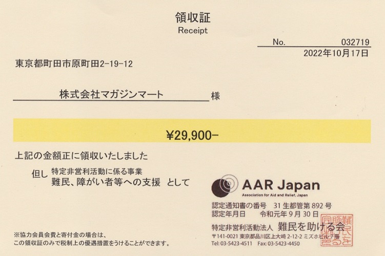 *領収書が届き次第アップします。