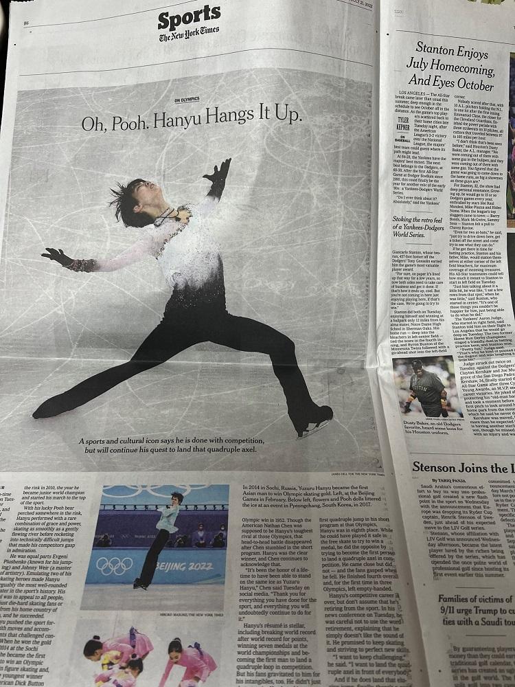 羽生くんの記念すべきプロ転向がアメリカでどのように報道されたのか気になり申し込みました。ダメモト予約でしたが入手頂きありがとうございました。 オリンピックの功績、決意表明会見の内容など素直に報道されており、ファンの気持ちもくんだ良記事だと思います。