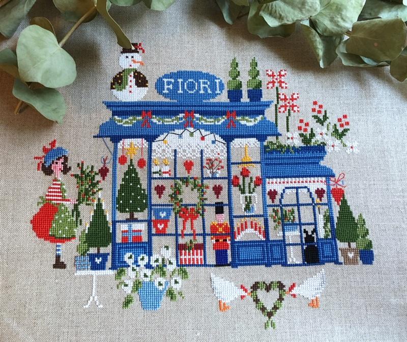 ブルーのショップが印象的。いろいろな小物たちも可愛らしく、カラフルで楽しい図案だと思い、購入しました。