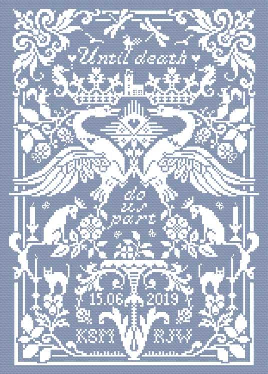 ブルー地に白糸でステッチしました。繊細で素敵な作品に仕上がりました。お二人のイニシャルを入れてプレゼントし、とても喜んでいただけました。ご結婚のプレゼントに素敵だと思います。
