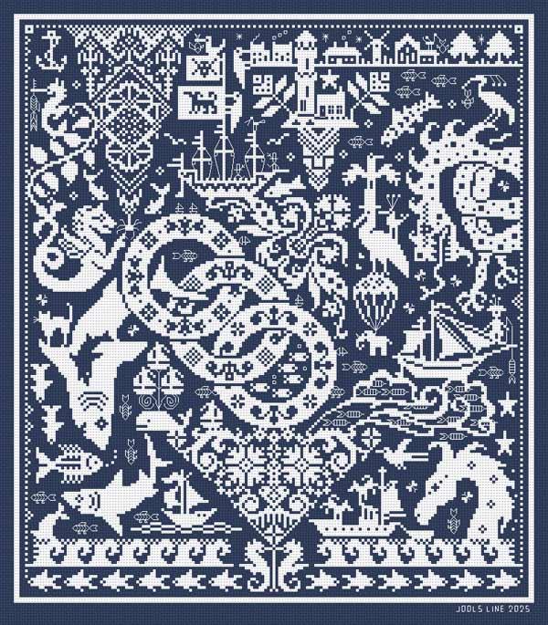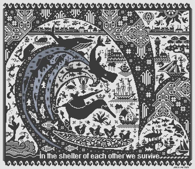 購入して一年、ようやく完成しました。泡の中がシェルターなんでしょうか、世界中の生物が、どんどん浮き上がってくるのが楽しく、刺し終えるのが惜しくてゆっくりゆっくり刺繍しました。