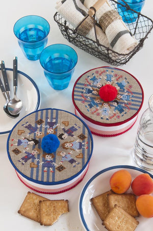 サモさんの浜辺で遊ぶ子供の図案がとても可愛いです。円形の図案は仕立てるのが難しそう… と思っていましたが、他の方がコースターと書いておられてなるほど!と思いました。参考にさせていただきたいです。