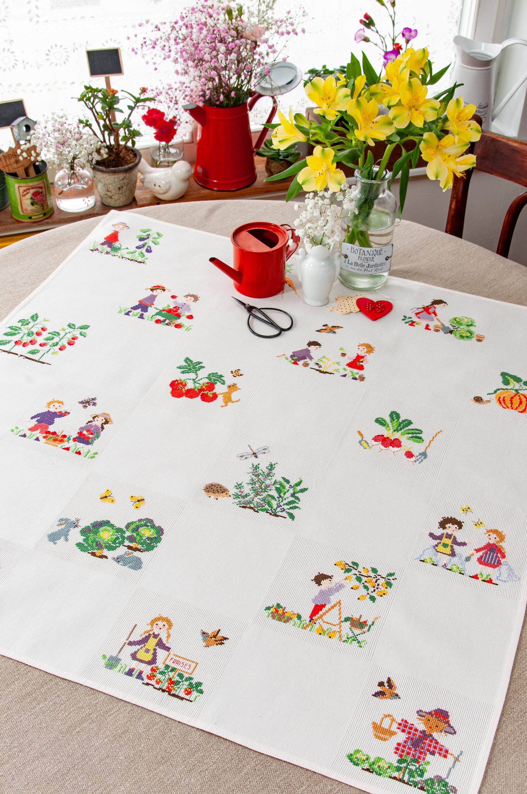 3月の発売時には購入を悩んでいたのですが、表紙にもあるうさぎの巾着が可愛すぎて購入してしまいました。作りたいものは他に山ほどあるのに、、、笑 私は子供の図案には全く興味がないのですが、今回のサモイロフさんのテーブルクロスは野菜の図案がたくさんあっていいなと思いました。一つずつの図案が子供だらけではないので、ワンポイントの刺繍としてかわいいと思います。
