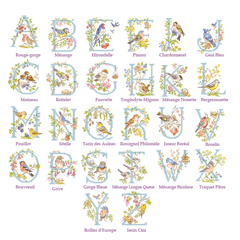 優しい色合いといい、ひとつひとつ違う植物と鳥が本当に繊細で素敵です。アルファベットなしで刺してもかわいいと思います。
