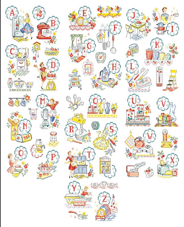 鮮やかな色彩で表現されたヴィンテージ感満載のキッチングッズ。アルファベットがなくても、気にいった図案を組み合わせておしゃれなサンプラーが出来そうな感じです。