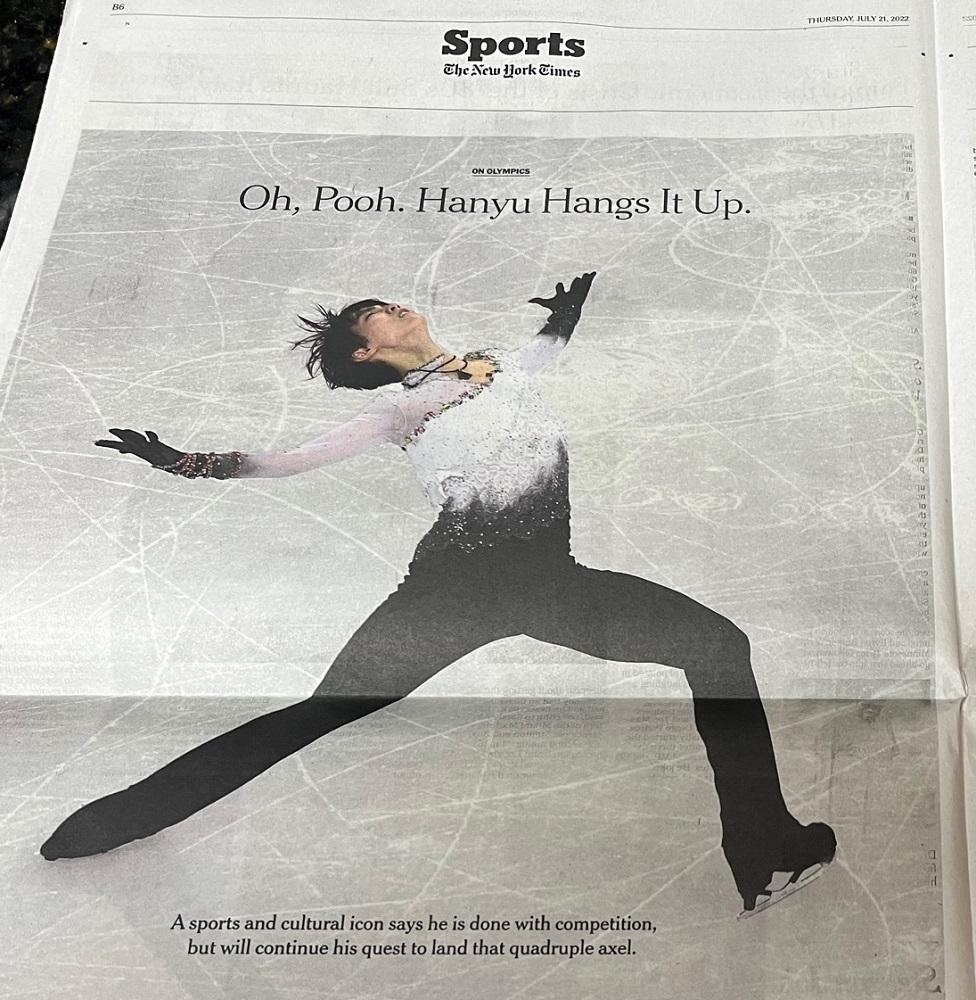 羽生くんの記念すべきプロ転向がアメリカでどのように報道されたのか気になり申し込みました。ダメモト予約でしたが入手頂きありがとうございました。 オリンピックの功績、決意表明会見の内容など素直に報道されており、ファンの気持ちもくんだ良記事だと思います。