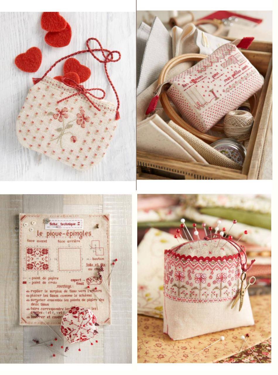ビスコーニュやポーチの完成品と、その作り方レシピをステッチして額装したものが並んでいるページがとても可愛く素敵で、いつか作ってみたいと思います。