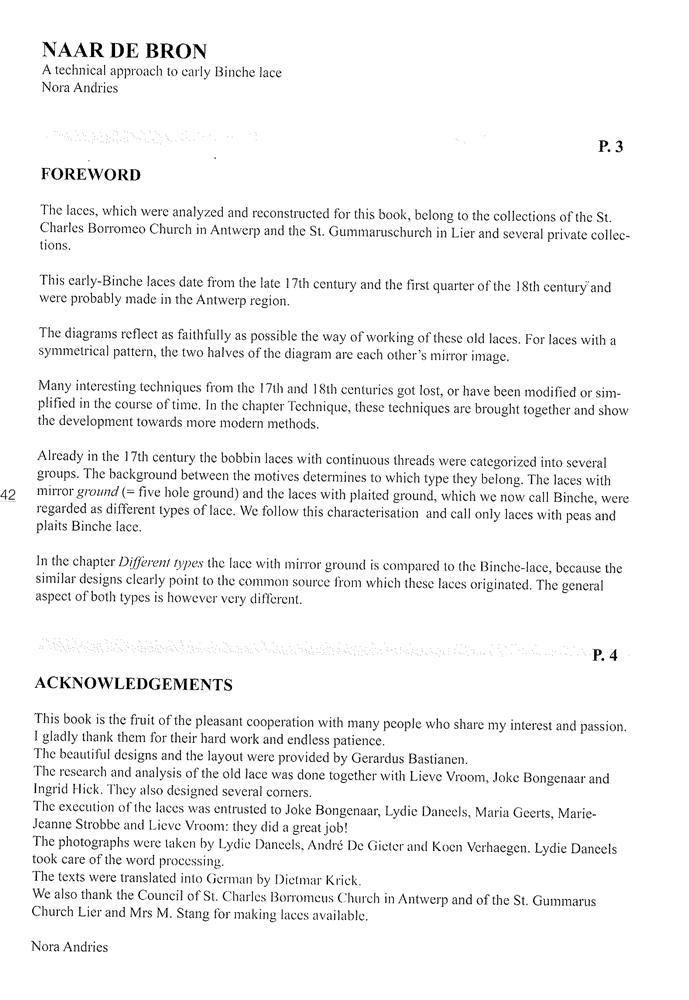 アントワープのthe Carolus Borromeus ChurchとLierのSaint Gummarus Churchのレースコレクションを分析、再構成したレース本です。 全22作品。 モノクロの組織図、写真や図も一部使い、作り方を丁寧に解説します。 Nora Andries has brought out a really splendid book, "Naar de bron, een technische benadering van vroeg Binche-kant" (Back to the Source, a technical approach to early Binche lace). It is published by the Carolus Borromeus Foundation from Antwerp. The bobbin laces from this publication, which were analysed and reworked, belong to the lace collections of the Carolus Borromeus Church in Antwerp (whose laces can also be seen in the Kantcentrum museum) and Saint Gummarus Church in Lier. There are also pieces from several private collections. The early Binche laces date from the 17th century and the first quarter of the 18th century. They were probably worked in the Antwerp area. The working diagrams reflect the method of working the old laces as faithfully as possible. The chapter on techniques brings together some lost or modified techniques and the development of a more modern method of working is shown. There is also a small chapter headed "Various types", which is interesting because lace with honeycomb ground is compared to Binche lace in it. And nice to know that, just as others have done before her, Nora confirms again in her book that it is far from clear where the lace got the name "Binche". It remains a mystery.... ページ数:183 出版社名:kantcentrum 著者名:Nora Andries 言語:英語含む4か国語 |
