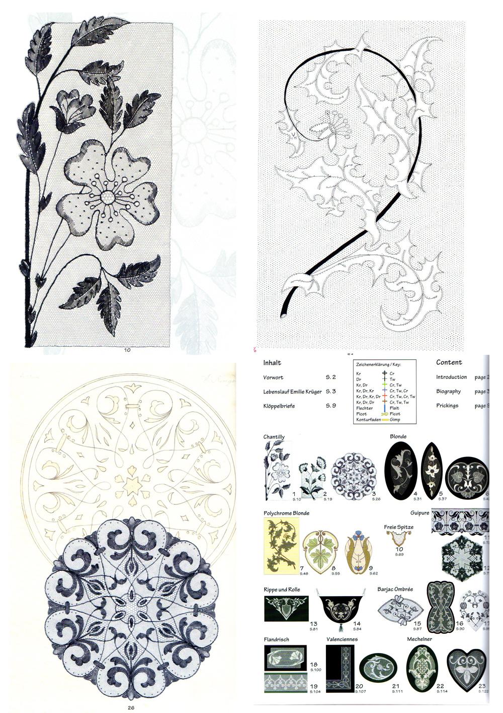 戦前、戦後の激動の時代を生きたEMILIE KRUGERさんの繊細で美しいアールヌーボー調のデッサン。それに感銘を受けた著者がボビンレースのプリッキングに書き起こした23作品が掲載されています。