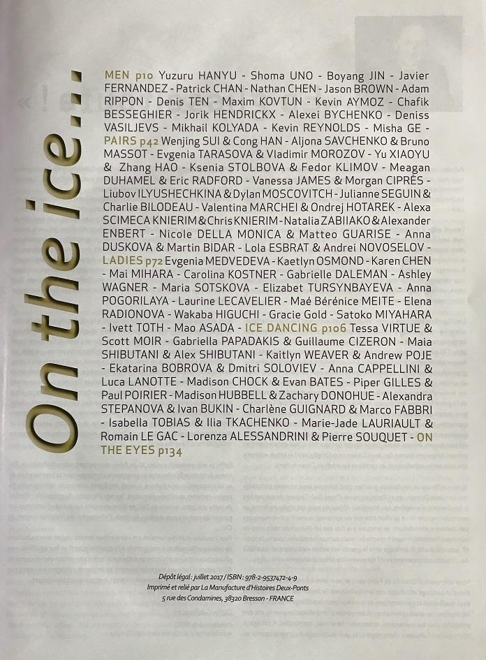 来年に迫った平昌オリンピックにむけての、シーズンの美しい瞬間をまとめた写真集&解説、重厚な書籍です。 解説にはフランス語と英語の両方の記載があるので日本人にも読みやすいです。 今年世界中で活躍した選手がずらりと掲載されており、まるでオリンピックに備えての選手名鑑のよう! 最後のページには、今シーズンの大会の結果がすべてまとめられています。 《主な掲載選手》 羽生結弦選手 7ショット 宇野昌磨選手 6ショット Evgenia Medvedeva選手 5ショット 他にもペア選手を含め、多数掲載 掲載されている選手名は内容画像を御確認ください。 ページ数:144 出版日:2017/08/09 出版社名:Patinage Magazine 言語:英語、フランス語 |