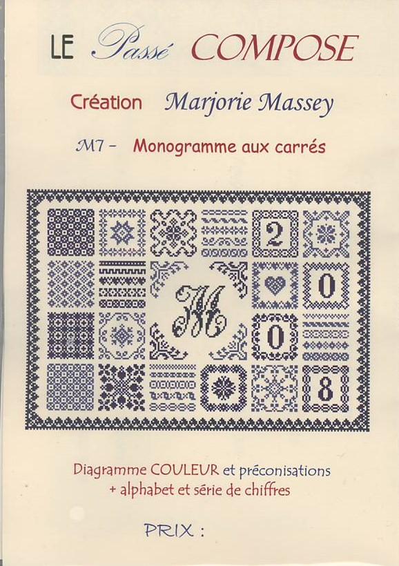 図案:正方形とアルファベットA-Zと数字0-9 ステッチ数:215 x 149 DMC刺繍糸番号:823,791,792もしくは815-816-309 著者名:Marjorie Massey 言語:フランス語 |