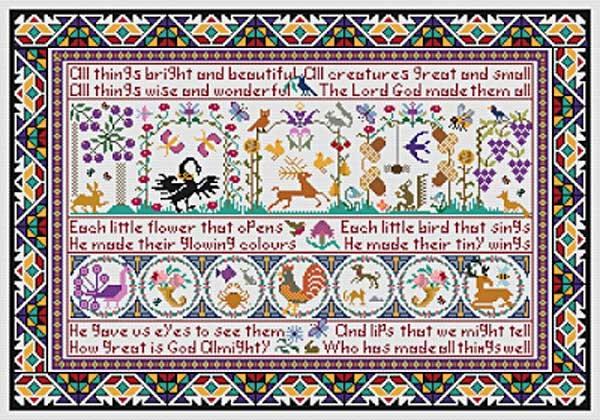 「All Things」(みんな明るく美しい)より ステッチ数: 350 x 241目 The words are taken from an Anglican hymn written by Cecil Francis Alexander and often sung in infant and primary schools at morning assembly 出版社名:Long Dog Samplers 著者名:Julia Line 言語:英語 |