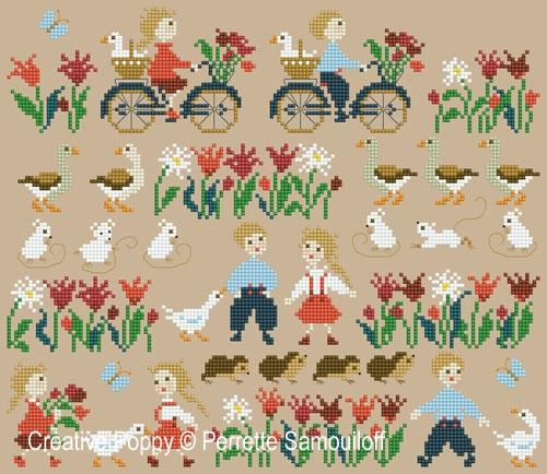 ステッチ数:148 x 128目 自転車をこいで、さぁ農場へ!ガチョウのクチバシにはご注意を。 お天気が良いので、ハリネズミの家族が出てきました。花の間を舞う蝶々たちもいます。 出版社名:Creative Poppy 著者名:PERRETTE SAMOUILOF 言語:英語 |
