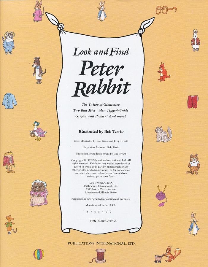・会期: 2021年2月27日早朝~3月6日(土) 0:00 ・数量: 1冊(最高額の1名様のみへの提供です) ・ダメモト予約でお買い物いただくことがご入札(ご応募)となります。 ・お買い物途中の「ご意見・ご感想」欄 ご購入希望の商品価格を1500円以上/100円単位で記述ください。 ・お一人様一回だけのご応募でお願いします。 (二回以上のご応募がある場合、全てのご応募が無効となります。) 【商品の状態について】 お客様からのご寄贈中古本です。(新品ではありません) 状態: 良 【価格記述に関するご注意】 ・事後に価格変更はできません。(お気持ちが確定してからお申込みください。) ・10円単位はすべて切り捨てとさせていただきます。 ・備考欄に価格の記述がない場合には、すべて1500円でのご応募で承ります。 ・同一価格に複数のご応募があつまった場合、 決選のため二度目の価格提示をしていただきます。(決まるまで繰り返し行なわれます。) 【ルールの補足】 ・商品価格とは別に、送料¥360&消費税が加算されます。 ・商品価格の50%が、 日本ナショナルトラスト協会の【アマミノクロウサギ】を守るキャンペーンへ寄付されます。 詳しくは、こちらのページをご参照ください。 【商品書評】 手芸図案ではありませんが、”うさぎつながり”ということで、そして、 何よりも大変魅力的な一冊なので、お願いしてご寄贈いただきました★ +゚☆゚+。+゚☆゚+。+゚☆゚++゚☆゚+。+゚☆゚+。+゚☆゚+ 早いおはなし、「ウォーリーを探せ」ならぬ、「ピーターを探せ!」です。 小さな子供向けながらイラストがとても可愛く、 ”うさぎ好き”ならば大人の方でも心を奪われることほぼ間違いなし! 最初のページ、 『ピーターはいたずらな小さなウサギでした。 彼は母親に背き、マクレガーさんの庭に直行しました。 しかし、彼は一人ではありませんでした!・・・』 とのメッセージからピーターとピーターのお友だち探しがスタートします♪ 英語、 楽しめる内容が全20ページ (うち、見開き全面イラストでピーターやキャラクターを探すページが18ページ) |