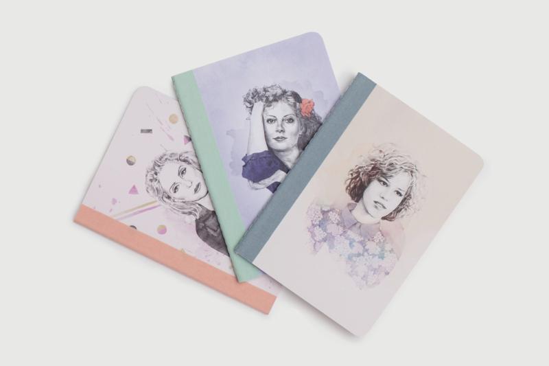 憧れの女性スター(モリー・リングウォルド、デビー・ハリー、スーザン・サランドン)が描かれた、3冊のミニサイズの罫線入りノートセット。