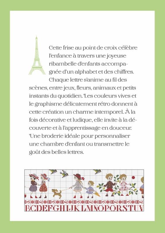 * … * … * … * …* … * … * このクロスステッチの図案は、楽しげに連なる子供たちの行列と、アルファベットや数字を通して子供時代を祝う作品です。 遊びや花、動物、そして日々の小さな一コマとともに、一文字一文字が生き生きと描かれています。 鮮やかな色彩と繊細なレトロ調のグラフィックが、この作品に時代を越えた魅力を与えています。 装飾的でありながら遊び心も満載で、優しく学びの世界へと誘ってくれるでしょう。 子供部屋のデコレーションや、美しい文字への関心を育むのにぴったりの刺繍作品です。 ∴‥∵‥∴‥∵‥∴‥∴‥∵‥∴‥∵‥∴ 図案サイズ:280横目×153縦目 出版社名:CESAR EDITION 言語:フランス語 |