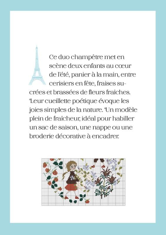サモイロフさんの想い(和訳): 「この田園風のデザインには、夏の真っただ中でかごを手にした二人の子どもが登場します。 満開のさくらんぼの木、甘いイチゴ、摘みたての花々に囲まれた収穫は、自然のささやかな喜びを思い起こさせます。 季節のバッグやテーブルクロスの装飾、額装の刺繍デザインとして最適な、爽やかな図案です。」 ∴‥∵‥∴‥∵‥∴‥∴‥∵‥∴‥∵‥∴ 図案サイズ:幅109目 x 高さ108目(文字を含む) 出版社名:CESAR EDITION 言語:フランス語 |