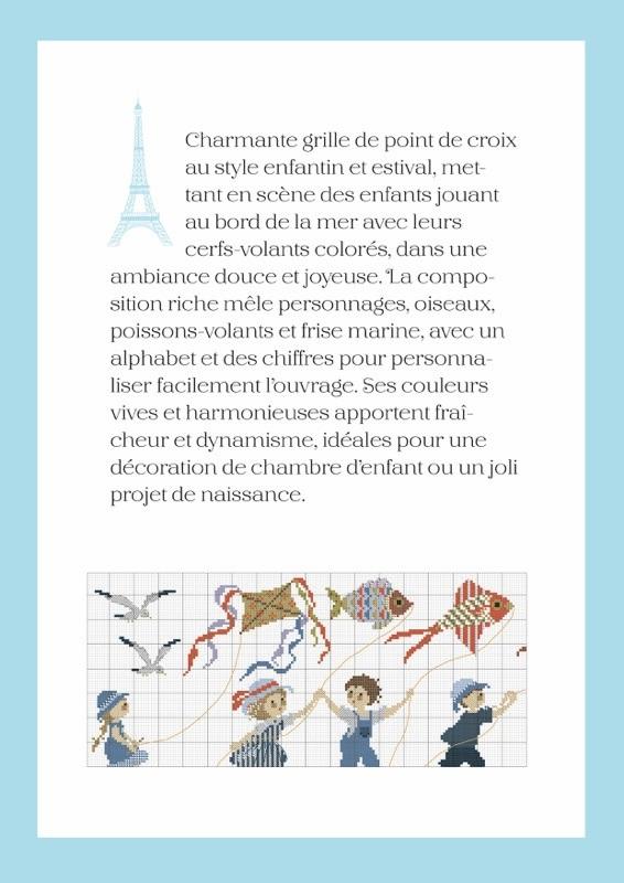 サモイロフさんの想い(和訳): 「子どもらしく夏らしい雰囲気が魅力のクロスステッチ図案です。 海辺でカラフルな凧を揚げて遊ぶ子どもたちを、やさしく楽しい雰囲気で描いています。 人物に加え、鳥や魚、海のモチーフのボーダーなどを豊かに組み合わせ、アルファベットと数字も含まれているため、オリジナルの作品に仕上げることができます。 明るく調和のとれた色合いが、子ども部屋のインテリアや出産祝いのプロジェクトにぴったりです。」 ∴‥∵‥∴‥∵‥∴‥∴‥∵‥∴‥∵‥∴ 図案サイズ:幅220目 x 高さ136目 出版社名:CESAR EDITION 言語:フランス語 |