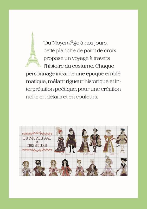 この図案は、中世から現代までの衣装の歴史をたどる旅へと誘います。 それぞれの人物が象徴的な時代を体現し、史実の厳密さと詩的な解釈が融合した、細部と色彩に富んだ作品です。 ∴‥∵‥∴‥∵‥∴‥∴‥∵‥∴‥∵‥∴ 図案サイズ:幅302目 x 高さ339目 出版社名:CESAR EDITION 言語:フランス語 |